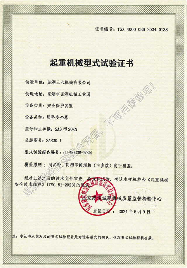 • SAS型20kN防墜器型式試驗(yàn)證書
